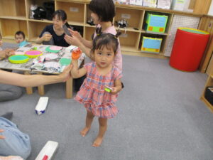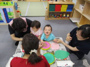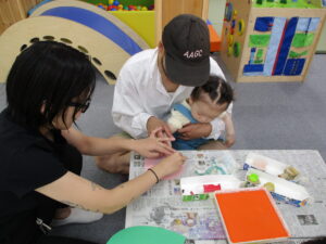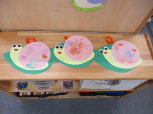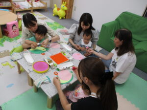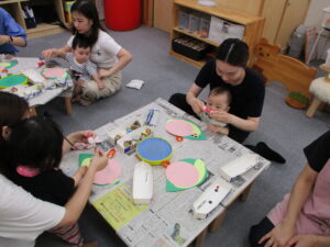 スタンプ遊び 2025.06.20 6月17日(火)にかたつむりのスタンプ遊びをしました。 梅雨ですねー。雨の日が続いたと思ったら、蒸し暑い日だったり…なかなか気持ち良く過ごせないですね⤵そんな中でも、今回のイベントに沢山のお友達が参加してくれましたよ! カタツムリをかたどった画用紙に、廃材で作ったスタンプや指を使ってインクをぽんぽんとつけて、かわいく彩り、中には大胆にインクを掌いっぱいにつけて、手形を付けている子もいました~♪ あとは目や口をつけて完成! 個性あふれる素敵なかたつむりができました。