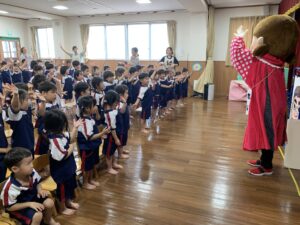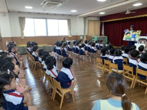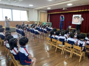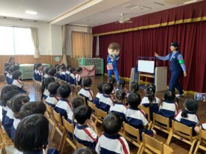 今日は大阪府警生活安全指導班の方をお招きして、防犯教室を行いました。子どもたちを誘拐しようとしている怪しいおじさん『ゆうかいするぞう』さんからどんな子が狙われやすいかを聞き、おまわりさんに、どうすれば狙われにくくなるのか、もし、連れていかれそうになった時はどうすれば良いのかを分かりやすく教えていただきました。