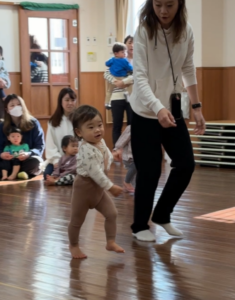 次はかけっこです。小さなお友達はハイハイや押し箱を押しながら。大きなお友達は自分で走りタンバリンをたたいてゴール!みんなが一生懸命でとってもかわいかったですよ。