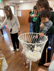 親子の玉入れでは、初めて見る玉入れに興味津々!保護者の方に抱っこしてもらって、カゴにたくさんの玉を入れていきました。