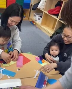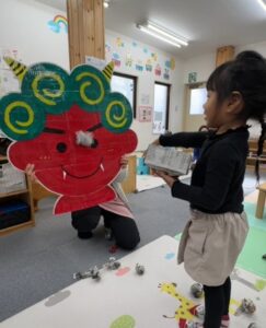 節分あそび 2026.02.13 鬼のお面製作では、おはながみで髪や表情をつくり、それぞれ個性あふれるかわいいお面を完成しましたよ! 製作の後は、新聞紙を丸めて作った“豆”を使って豆まき遊び♪ 大きな鬼の的に向かって「おにはそと!」と元気いっぱい豆を投げ、笑顔と元気な声に包まれるひと時になりました。